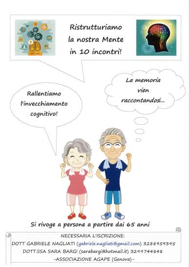 per contatti, informazioni e iscrizioni: dott. Gabriele Nagliati gabriele.nagliati@gmail.com 3288959395 e dott.ssa Sara Bargi, sarabrgi@hotmail.it 3299744848 ASSOCIAZIONE AGAPE-GENOVA