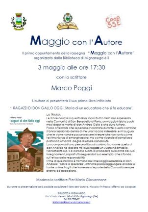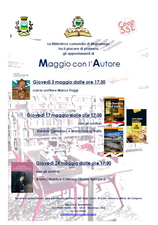 Riprendono gli appuntamenti con autori e autrici espressione del territorio, un calendario di incontri che nel mese di maggio offrirà alla cittadinanza di Mignanego un percorso di lettura, discussione e approfondimento tra generi, stoerie e stili diversi.