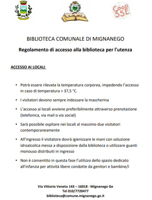 Per tutte le nostre care lettrici e cari lettori un piccolo vademecum per poter accedere alla Biblioteca di Mignanego in sicurezza e tranquillità.Vi aspettiamo! 📚📖