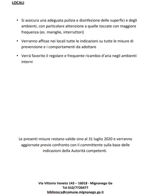 Le presenti misure restano valide sino al 31 luglio 2020 e verranno aggiornate previo confronto con il committente sulla base delle indicazioni della Autorità competenti.