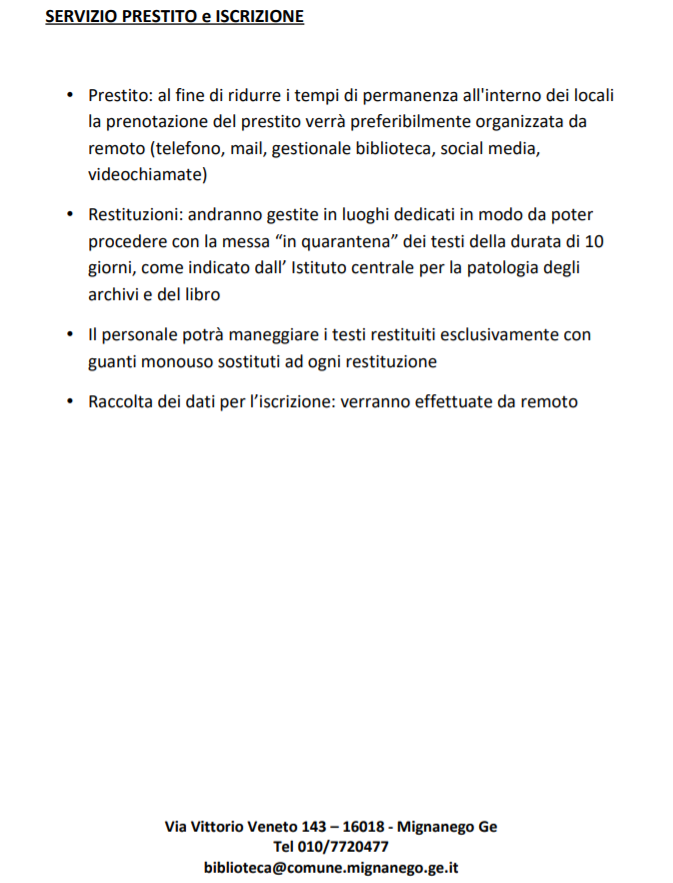 Al fine di ridurre i tempi di permanenza dei locali per le prenotazioni del prestito verrà preferibilmente organizzato da remoto (telefono, mail, gestionale biblioteca, videochiamate.