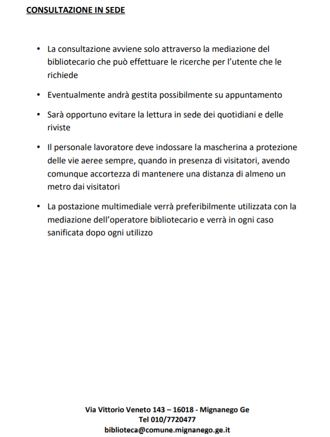 Per tutte le nostre care lettrici e cari lettori un piccolo vademecum per poter accedere alla Biblioteca di Mignanego in sicurezza e tranquillità.Vi aspettiamo! 📚📖