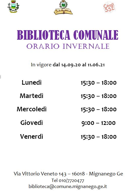 Da Lunedì 14 settembre, entrerà in vigore l’orario invernale della nostra biblioteca!